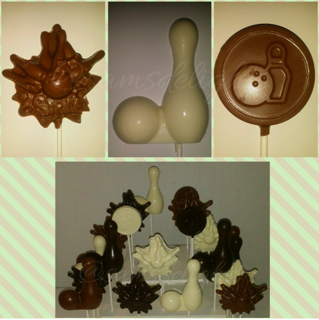 Yum Chocolate Lollipops by Sam's Delights! I ordered these bowling pops & they were great. She has an assortment of treats. Samanda Rene has created her delights just for you. Place your order today Samsdelights.com